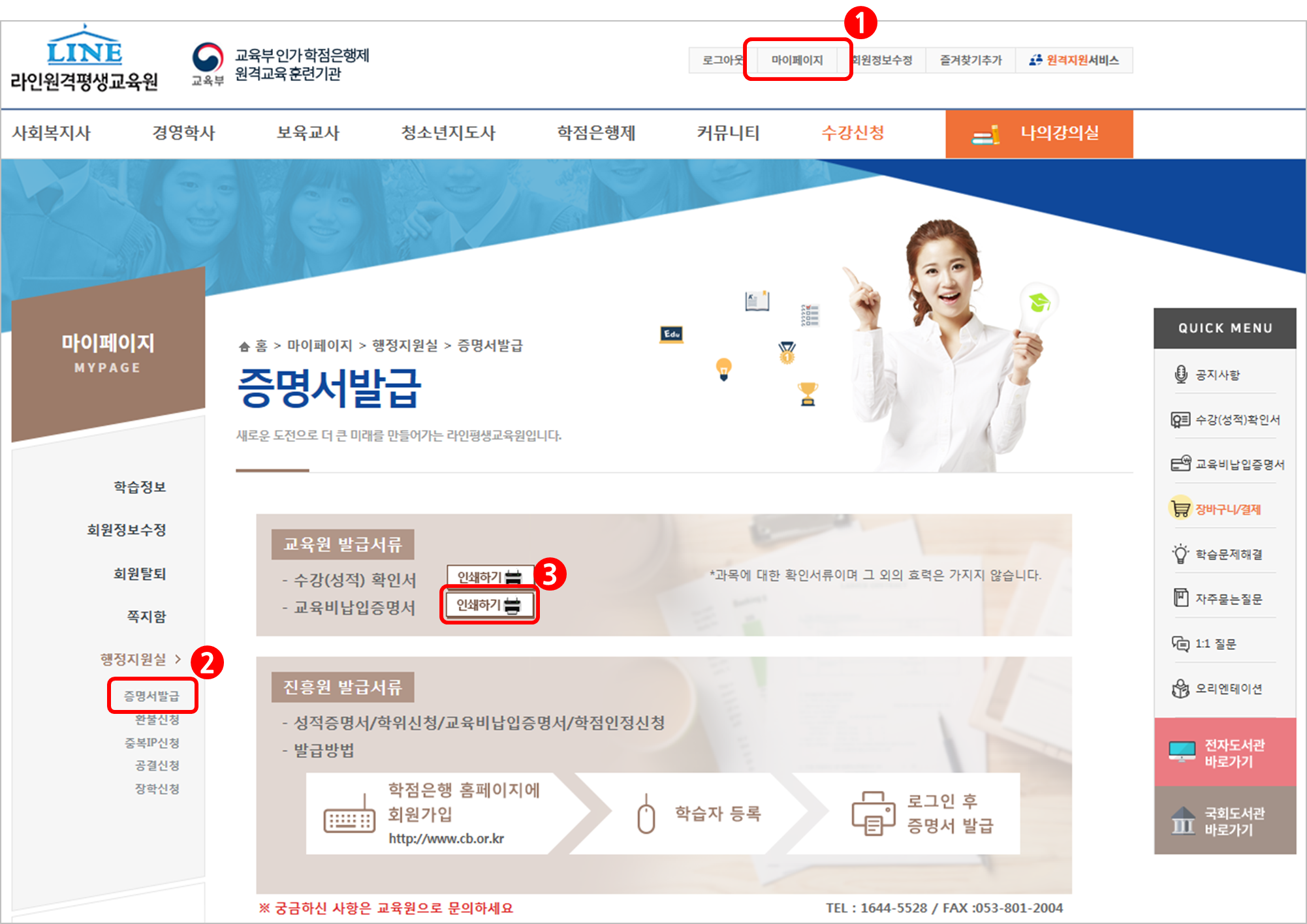 - ·Î±×ÀÎ ¡æ ȨÆäÀÌÁö »ó´Ü ¡®¸¶ÀÌÆäÀÌÁö' Ŭ¸¯ ¡æ ÆäÀÌÁö ÁÂÃø ¡¯Áõ¸í¼¹ß±Þ¡® Ŭ¸¯ ¡æ ±³À°ºñ³³ÀÔÁõ¸í¼ ¿· ÀμâÇϱâ Ŭ¸¯