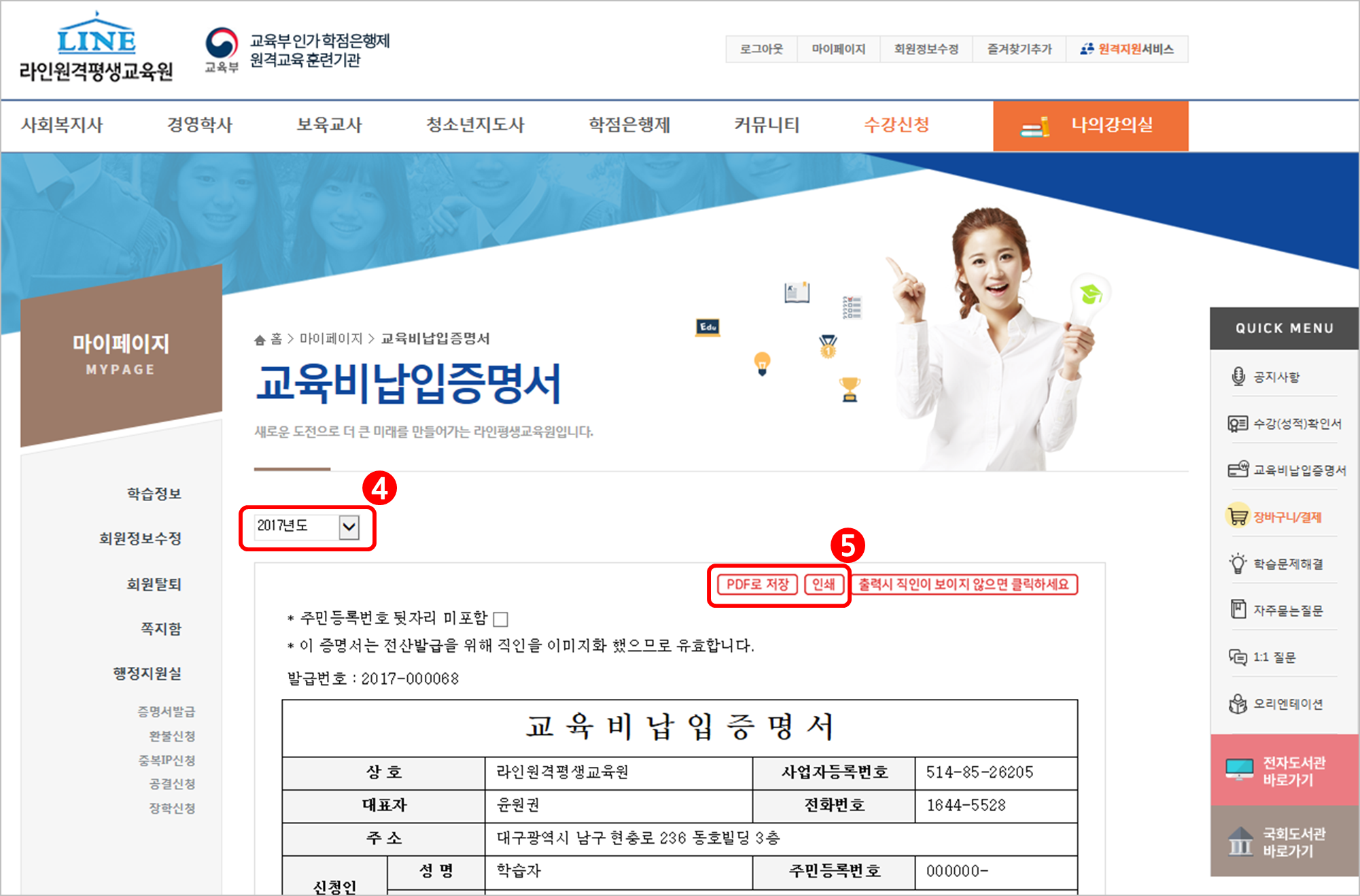 - ·Î±×ÀÎ ¡æ ȨÆäÀÌÁö ¿ìÃø Äü¸Þ´º(QUICK MENU) '±³À°ºñ³³ÀÔÁõ¸í¼' Ŭ¸¯ ¡æ ³âµµ ¼±Åà ¡æ ¡®PDF·Î ÀúÀ塯 ¶Ç´Â ¡®Àμ⡯